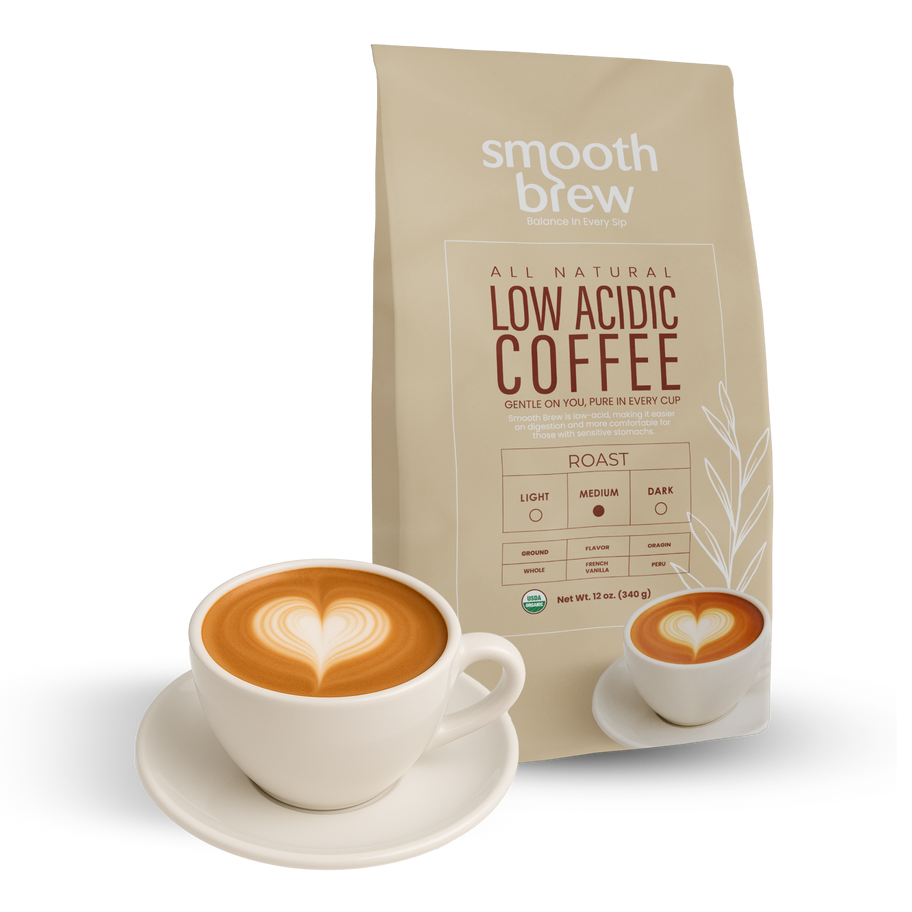 Smooth Brew™ is low-acid coffee that actually tastes amazing. We use a proprietary, all-natural process to remove up to 90% of the acid found in traditional coffee — without sacrificing
